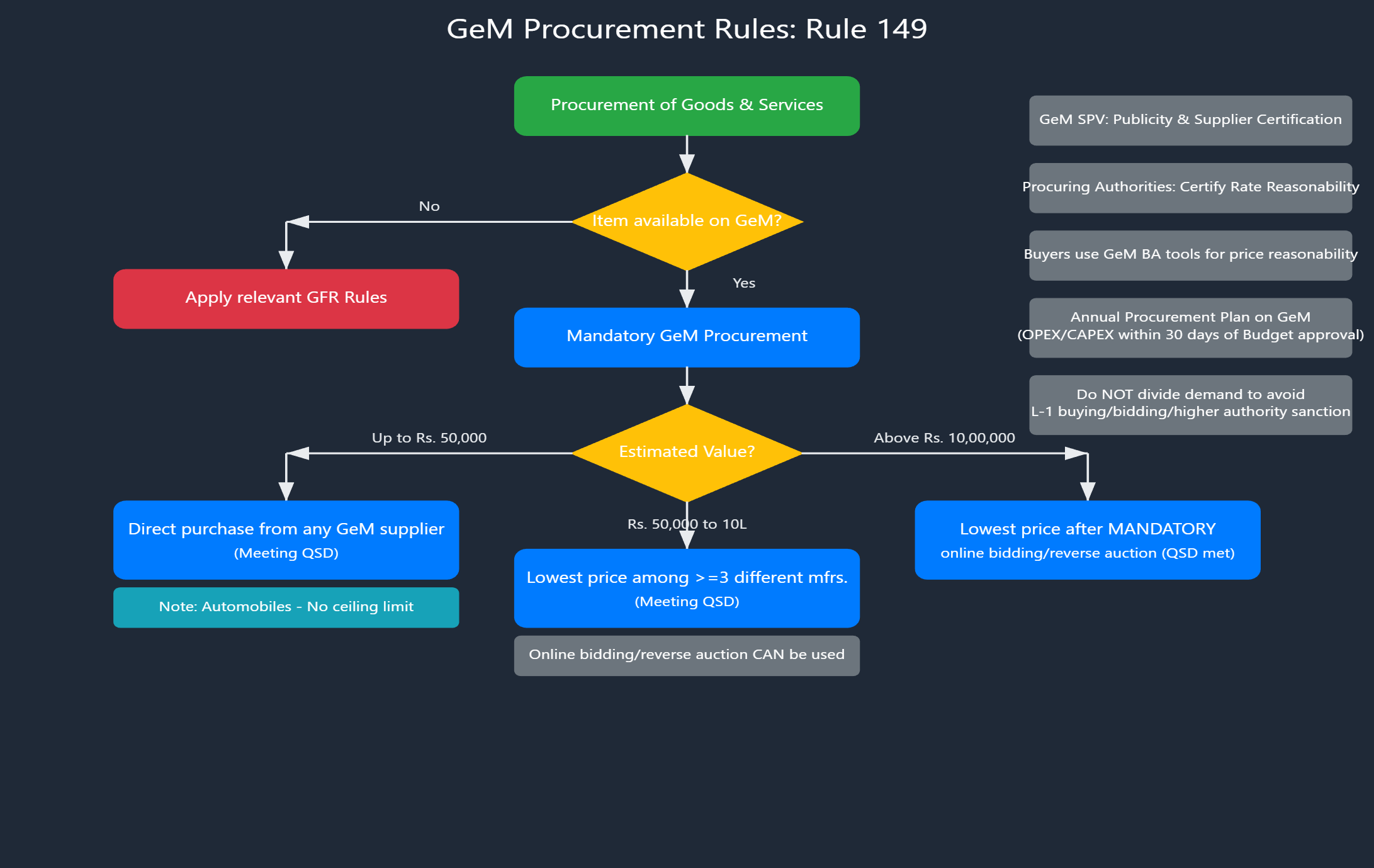 Rule 149 establishes the Government e-Marketplace (GeM) as the primary platform for government procurement, aiming to enhance transparency, efficiency, and competition. This rule makes it mandatory for Ministries and Departments to procure goods and services available on GeM, with specific procedures tailored to different transaction values.