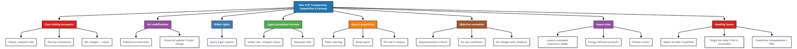 Rule 173 of the General Financial Rules, 2017, mandates that all government procurement processes must be conducted with transparency, competition, and fairness to achieve the best value for public money. It outlines essential measures, including the creation of clear and comprehensive bidding documents, the establishment of eligibility and qualification criteria, procedures for bid submission and opening, and guidelines for bid evaluation. The rule also addresses modifications to bidding documents, dispute settlement, and the importance of pre-bid conferences. It emphasizes awarding contracts to the lowest evaluated responsive bidder and justifies bid rejection only under specific conditions, promoting accountability and preventing arbitrariness in public buying.