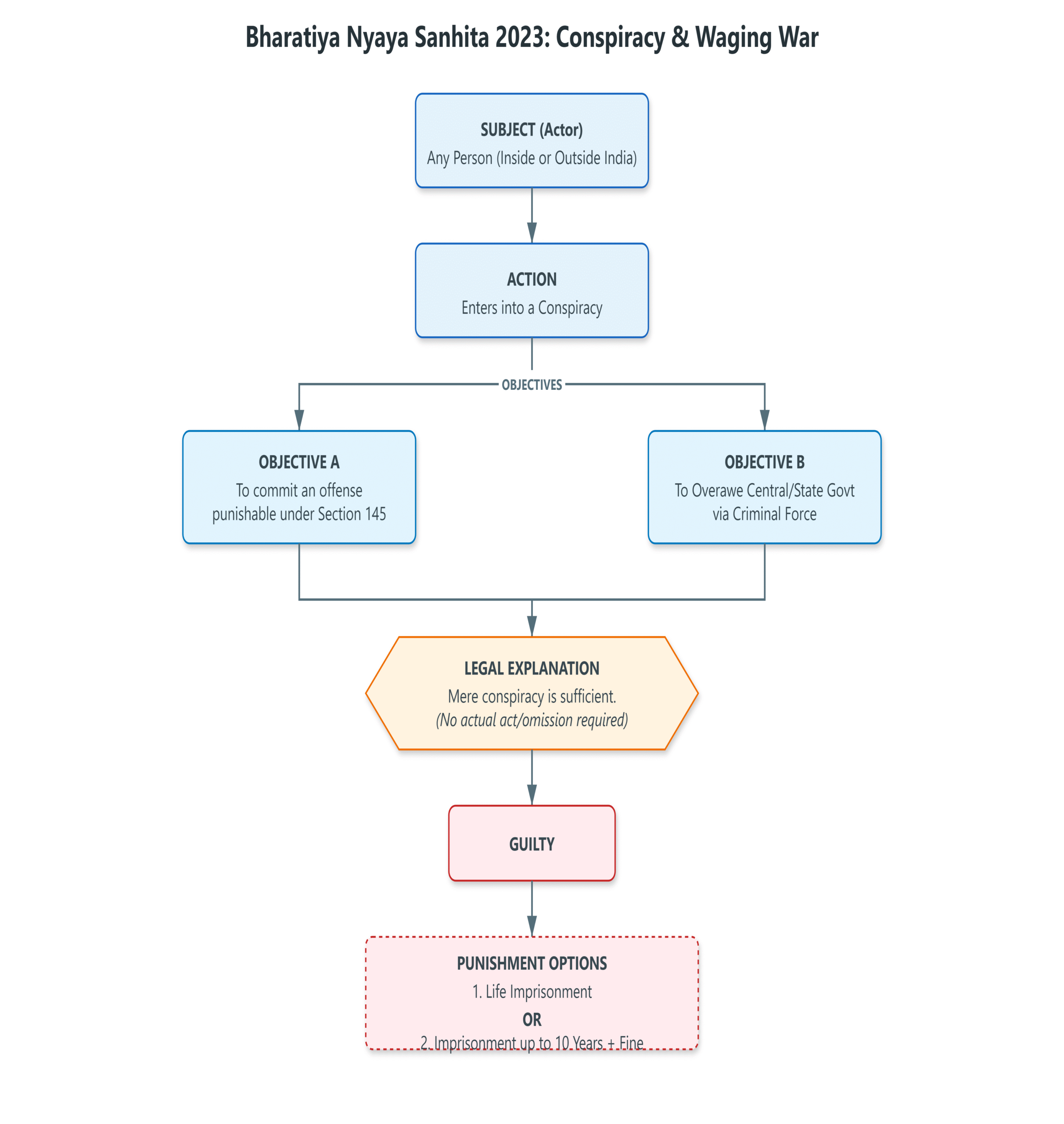 जो कोई भी भारत के भीतर या बाहर और बाहर धारा 145 द्वारा दंडनीय किसी भी अपराध को करने की साजिश करता है, या आपराधिक बल या आपराधिक बल के प्रदर्शन के माध्यम से केंद्र सरकार या किसी राज्य सरकार को भयभीत करने की साजिश करता है, उसे दंडित किया जाएगा। आजीवन कारावास, या किसी भी प्रकार का कारावास, जिसे दस साल तक बढ़ाया जा सकता है, और जुर्माना भी लगाया जा सकता है।